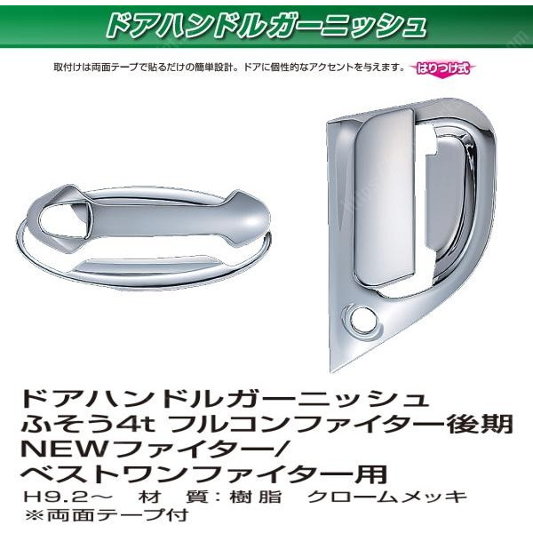 ●商品名:ドアハンドルガーニッシュフルコン/NEWファイター/ベストワンファイター用●品番:572215●材質:樹脂製クロームメッキ仕上げ●規格:フルコンファイターH4.8~H9.1NEWファイターH9.2~H17.9ベストワンファイターH17.10~●入数:1セット●付属品:両面テープ●画像のため実際の商品とは多少色が違って見える場合があります