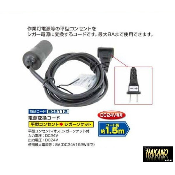 ●電源を取り出すのに困ったことはありませんか? 最近の車は助手席コンソル下に差込がありますので、そこに差し込んで 簡単に24Vの電源が取り出せます●502112●24V8A以下で使用してください※電圧変換機能はありません。※シガーライターは使用できません。