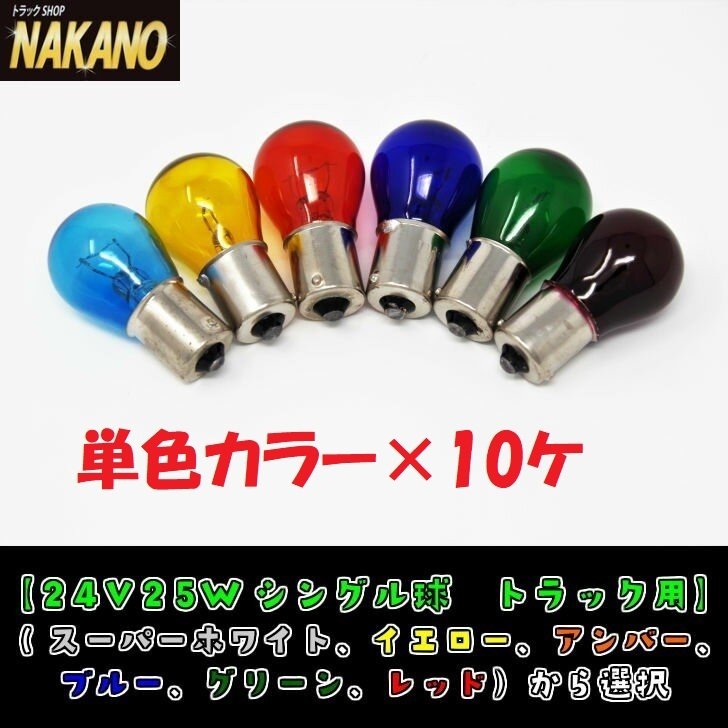 ●24V専用25W●口金サイズ:BA15S S-25●生地着色球なので塗装球と違い色あせしません●画像色は実際の色と多少違って見える場合があります●カラーを選択ください ・スーパーホワイト ・イエロー ・アンバー ・ブルー ・グリーン ・レッド
