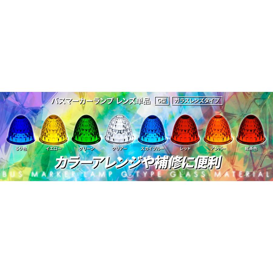 ●G型バスマーカーランプ用レンズ単品。 ガラス製●JET製/YAC製/JB製に適合●変色しにくいガラスレンズ●単色1ヶの価格です●カラーを選択ください瑠璃色:631581イエロー:631582グリーン:631583クリアー:631584スカイブルー:631585レッド:631587アンバー:631588紅茶:631589