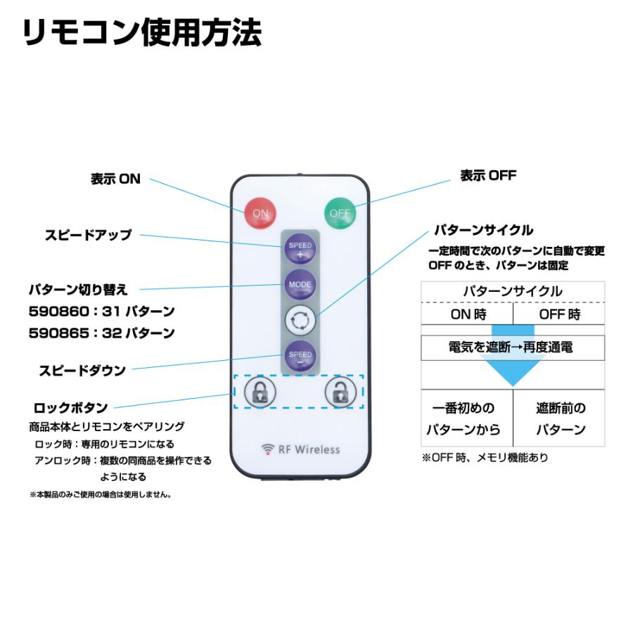 ●リモコン動作:表示ON/OFF、モード変更(表示パターンの切り替え)、パターンサイクル、スピード調整
