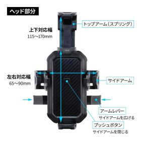 ●スマホのホールド部分はヨコ65〜90mm、タテ115〜170mmまで幅広く、ワンタッチ取付けのプッシュボタンタイプ